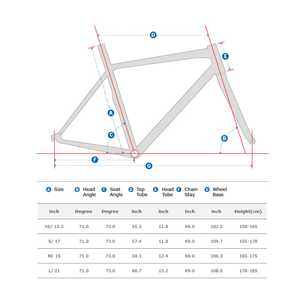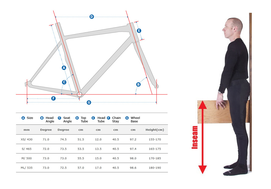 일반적으로 위 그림의 (A) 그러니까 크랭크축이 되는 비비의 센터부터 안장봉(싯포스트)이 결합되는 싯클램프 부분까지. 싯튜브의 길이를 자전거의 사이즈로 표기합니다. 490 사이즈니 510 사이즈니 하는 게 저 싯튜브의 길이를 말합니다. 490사이즈라면 (A)부분이 49cm인 거에요. 사이즈는 싯튜브 길이를 말하지만 사실상 중요한 건 (B)의 길이, 싯튜브 센터와 핸들이 장착되는 헤드튜브 센터까지의 거리인 탑튜브 길이가 중요합니다. 안장에 앉았는데 핸들이 너무 가까워서 구부정하거나 과도하게 멀어서 허리를 숙이고 팔은 만세를 하듯이 쭉 펴고 타는 불상사가 생기지 않게요. 고르고타고에서는 각 자전거의 지오메트리 (프레임의 각 부분의 길이)를 제공하거나 지오메트리가 제공되지 않는 자전거의 경우에는 적정 신장에 따른 사이즈 선택 가이드를 안내해 드리고 있습니다. 쉽게는 상세 페이지에 안내되는 대로 선택해주시면 되는데 간혹 키는 작은데 팔다리가 기하학적으로 길거나 키는 큰데 팔다리가 엄청나게 짧으신 분들은 한 사이즈 크거나 작게 주문하시면 됩니다. 싯튜브 (A) 부분이야 사실 안장봉(싯포스트)로 높낮이 조절을 하면 되지만 (B)의 경우에는 스템, 핸들을 교체하는 방법 외에는 길이 조절이 어려우니까요. 조금 더 깊숙히 들어가 볼까요? ▣ 로드 바이크 사이즈 측정 ▣