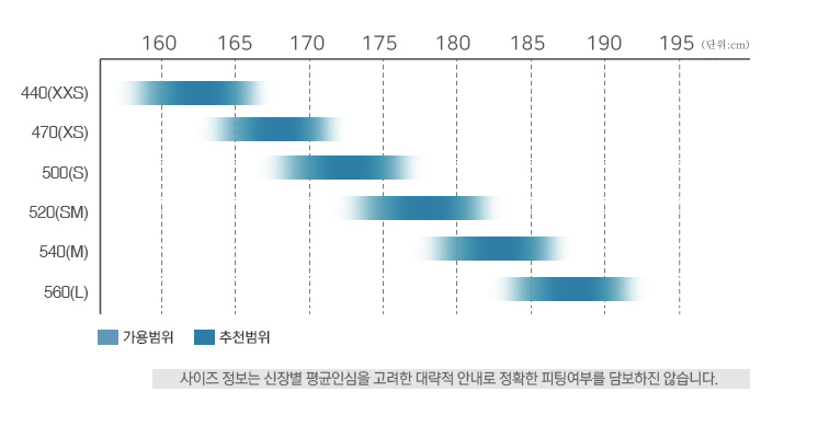 프레임 사이즈는 440부터 560까지 다양하게 준비되어 라이더 신체조건에 맞춘 피팅이 가능합니다.