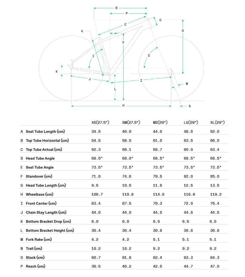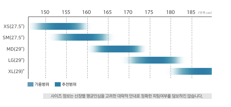 27.5인치와 29인치 휠사이즈가 각 프레임사이즈에 맞추어 적용되는 모델로 XS, SM 사이즈는 27.5인치 규격의 휠이 적용되며 MD, LG, XL 사이즈는 29인치 규격의 휠셋이 적용됩니다.