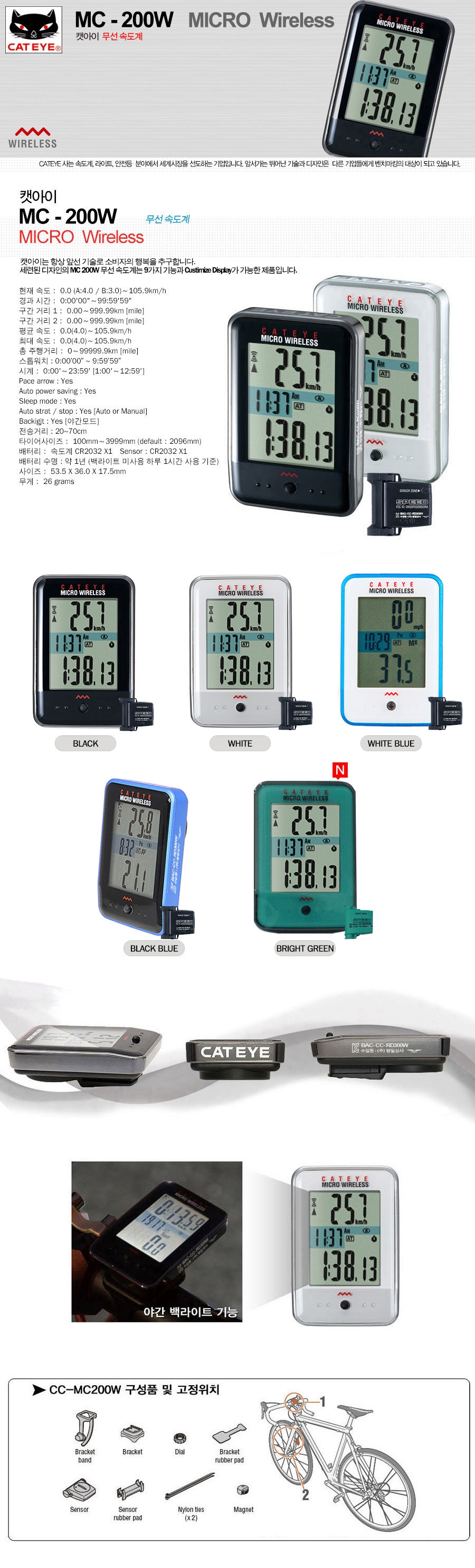 캣아이 MC-200W 와이드 무선속도계 백라이트 기능