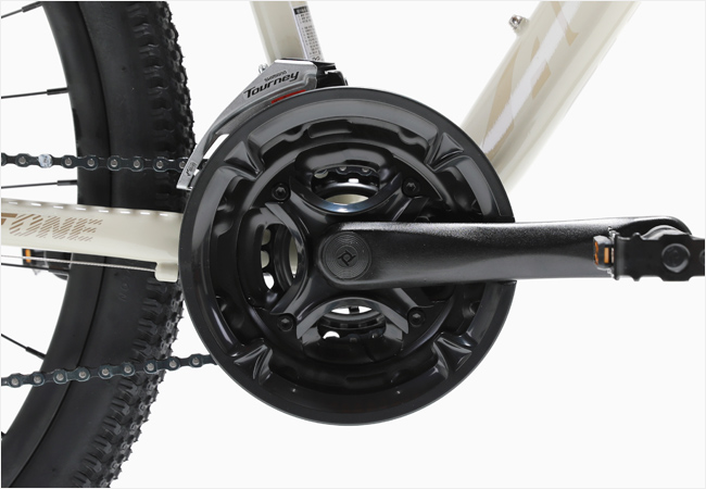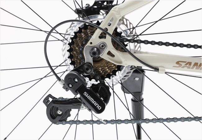 샌드스톤 26D에는 부족함없는 기어비를 지원하는 시마노 투어니 3x7단(21단) 변속시스템이 적용되었습니다.