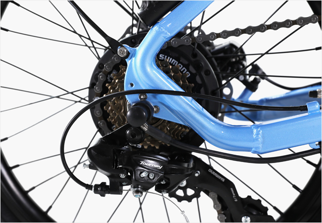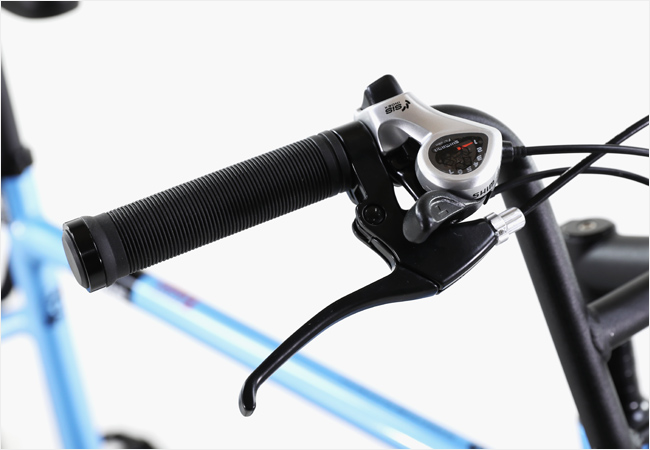 다양한 환경에 보다 효율적인 주행을 지원하는 외장기어는 시마노 7단 변속시스템이 적용되었으며 핸들바에 장착된 섬시프트 레버를 통해 간편하게 컨트롤 됩니다.