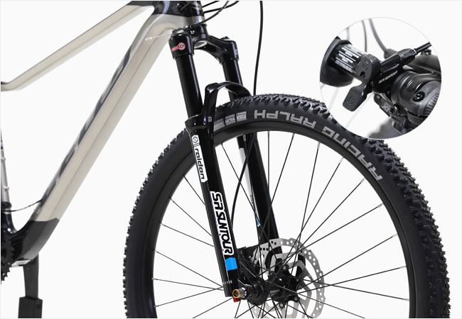 가성비 좋은 SR 선투어 레이돈32-부스트 서스펜션 포크는 거친 코스에서도 코스를 안점감 높은 승차감으로 주행할 수 있도록 서포트 하며 핸들바에 장착된 리모트 컨트롤레버를 통해 손쉽게 서스펜션의 락아웃 컨트롤이 가능합니다.