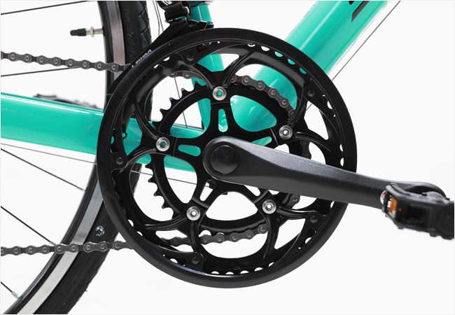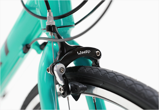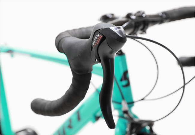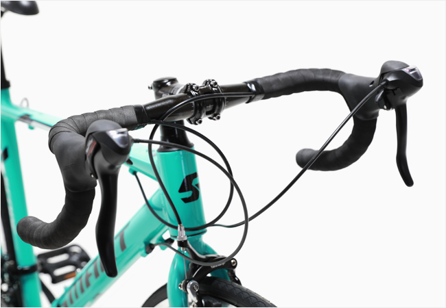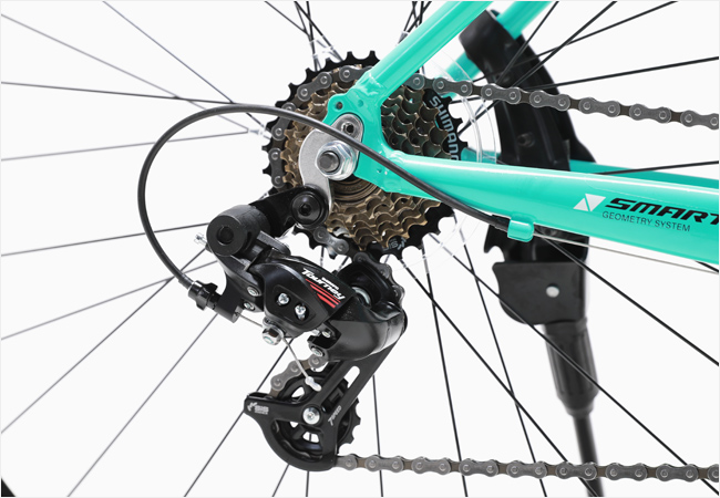 포지션의 변경없이 변속과 제동조작이 가능한 시마노 투어니(A070)STI 시프터가 적용되었으며 시마노 변속시스템(2x7단)이 적용되어 다양한 코스에 효과적인 라이딩을 지원합니다.