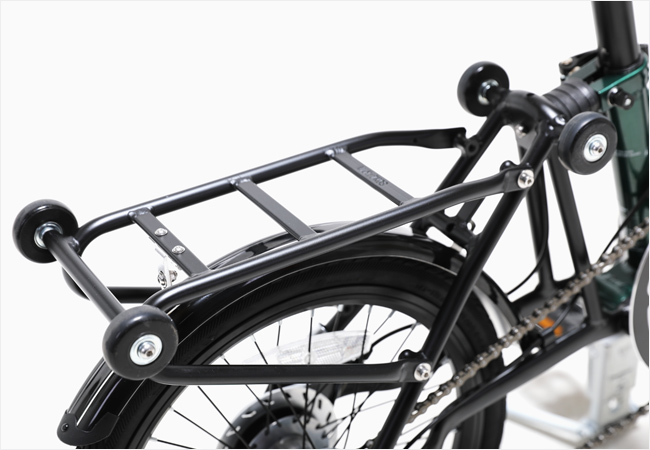 주행시에는 짐받이에 적재물을 수하할 수 있으며, 폴딩시에는 짐받이에 장착된 4개의 롤러(폴리우레탄)를 통해 자전거를 간편하게 이동시킬 수 있습니다.
