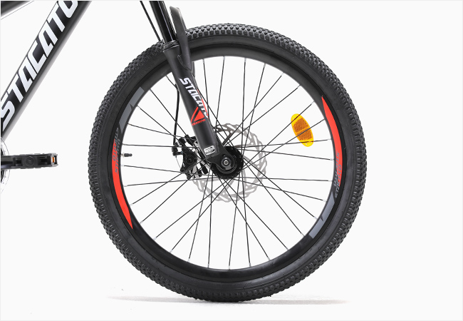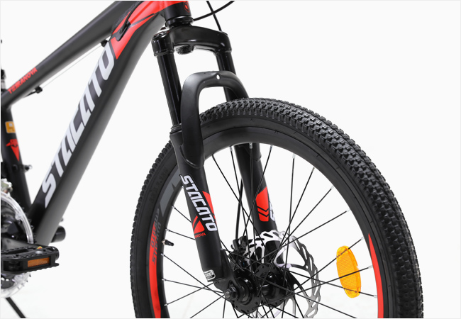 주행중 발생하는 충격을 완화시켜주는 서스펜션 포크 적용되어 안정된 승차감의 라이딩을 즐길 수 있습니다.