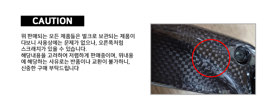 - 수작업으로 조립되고 수차례에 걸쳐 운반되는 자전거 상품의 특성상 불가피하게 발생되는 경미한 스크래치 및 오염, 부품체결 및 볼트장착부위의 도장 크랙.