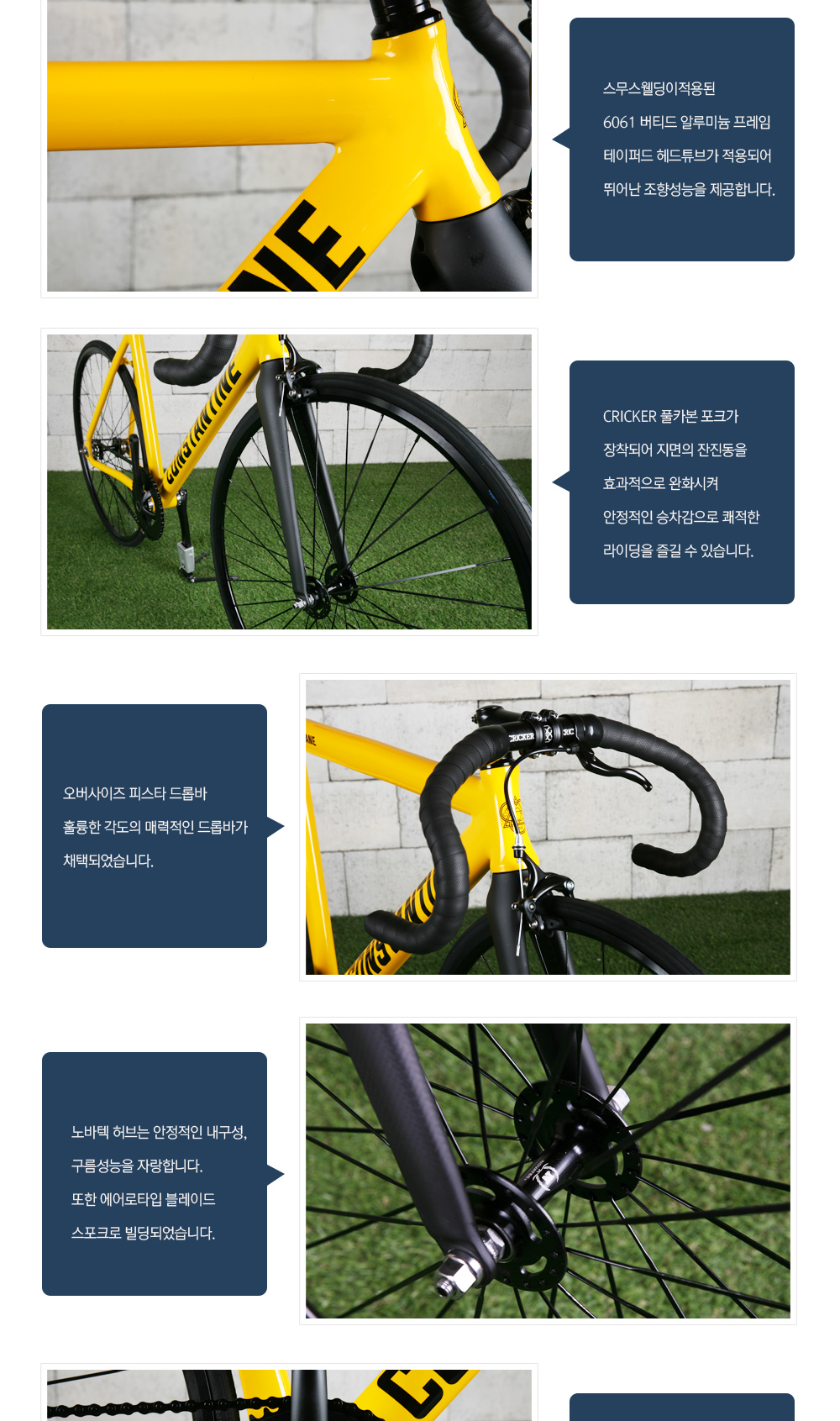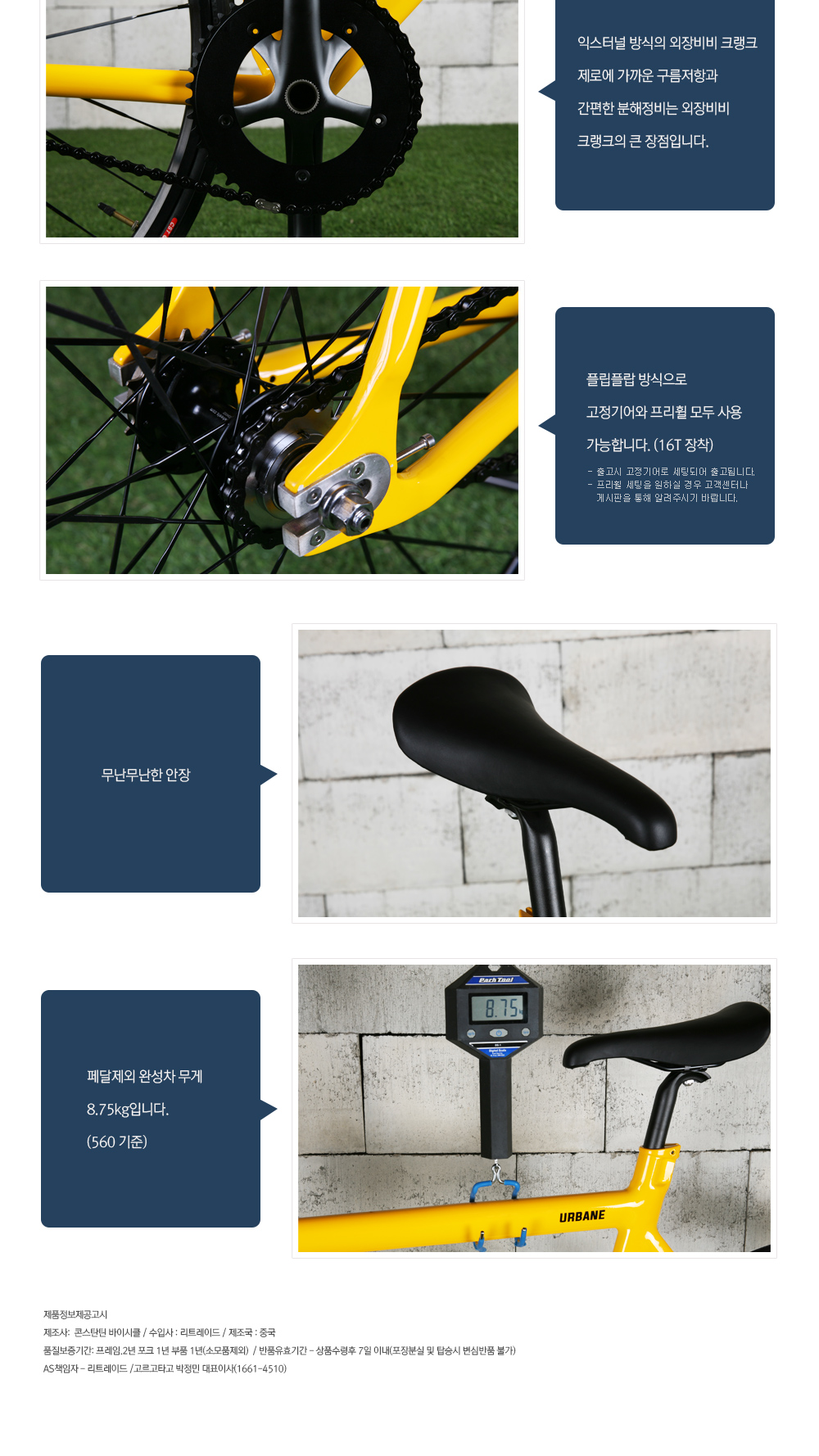 - 수작업으로 조립되고 수차례에 걸쳐 운반되는 자전거 상품의 특성상 불가피하게 발생되는 경미한 스크래치 및 오염, 부품체결 및 볼트장착부위의 도장 크랙.