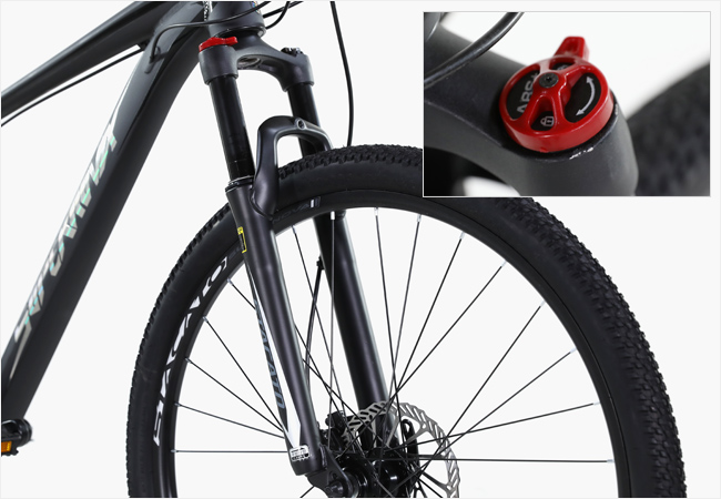 프레임과 함께 구성된 서스펜션 포크는 100mm 트레블을 지원하며 서스펜션의 리바운드 기능을 On/Off 할 수 있는 락아웃레버가 설치되어 효율적인 주행을 즐기실 수 있습니다.