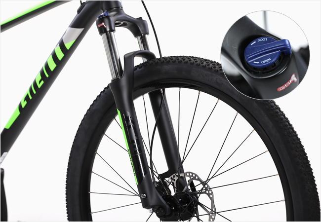 또한 포크상단에 위치한 락아웃 레버를 통해 서스펜션 기능을 컨트롤 할 수 있습니다.