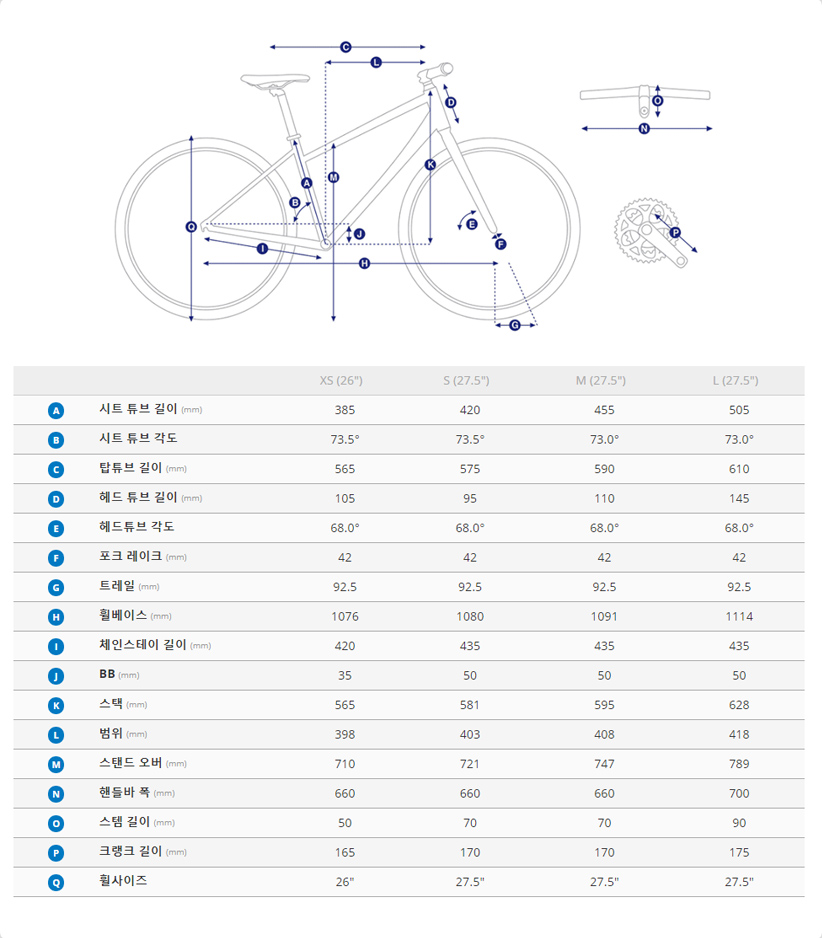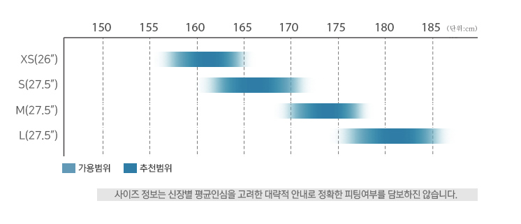 아담한 신장의 라이더분들이 타기좋은 XS 사이즈는 26인치 휠이 적용되어 더욱 부담없이 탑승가능하며, S 이상의 사이즈는 27.5 규격의 휠셋이 적용되었습니다.