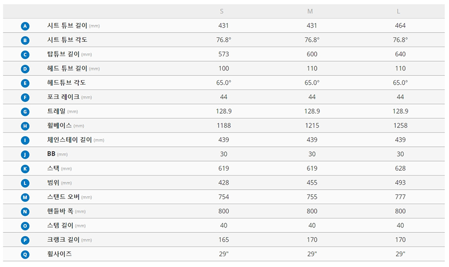 29인치 휠에 최적화된 혁신적인 최신 지오메트리는 체인스테이는 짧게, 탑튜브는 길게 만들었으며, 헤드튜브 각도(65도)와