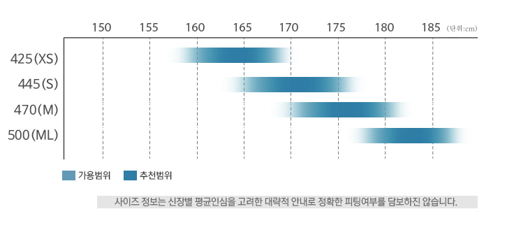 제품사이즈는 425(XS) 부터 500(ML) 4가지 사이즈로 준비되었으며 제사한 피팅정보는 하단 표를 참조해주시기 바랍니다.