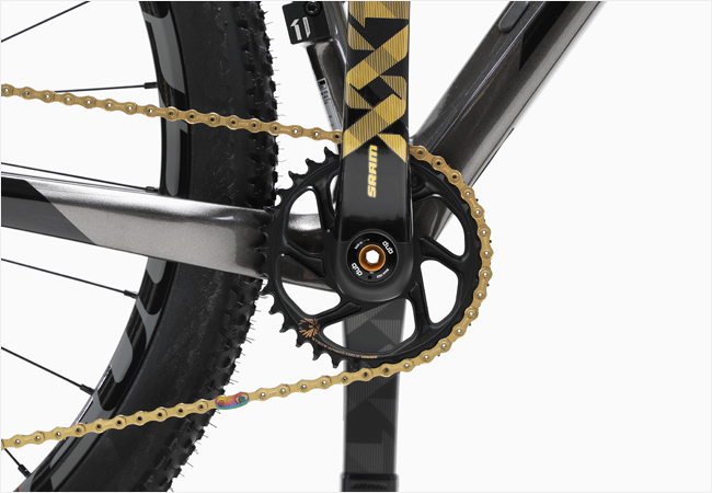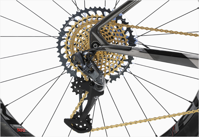황금빛의 매혹적인 자태를 자랑하는 스램 이글 XX1 그룹셋은 1x12의 싱글 체인링 시스템으로 거친 주행환경에서도 안정적인 시프팅 성능과 견고한 페달힘전달력을 제공합니다.