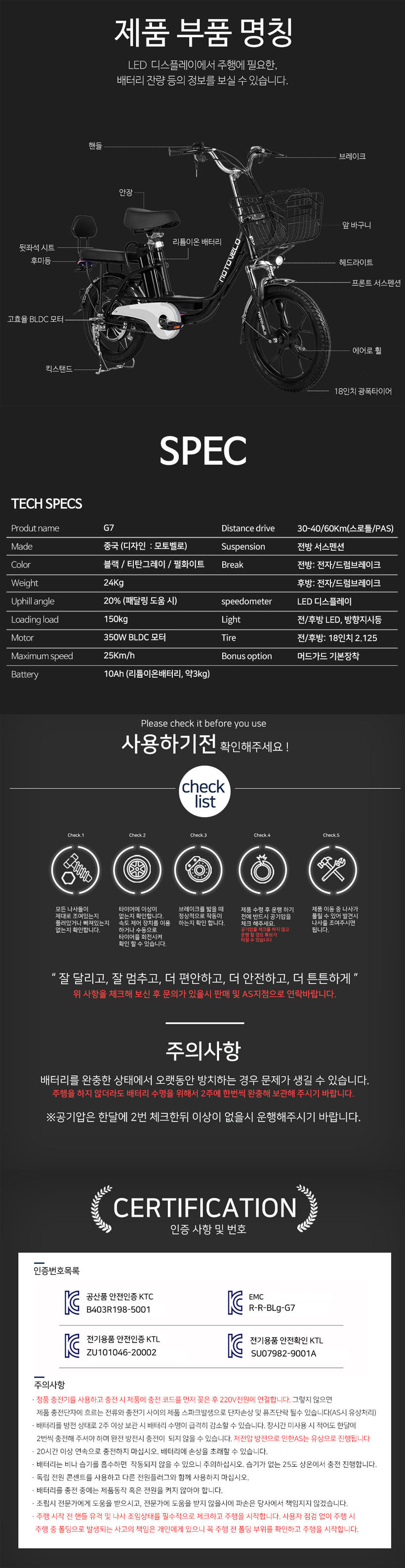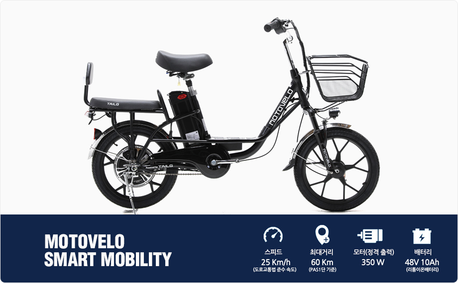 모토벨로의 다양한 제품중 일상생활에서 유용하게 탑승가능한 'G7'은 350W의 고출력 BLDC 허브모터와 48V 10Ah의 고용량 리튬이온 배터리로 구성된 스쿠터형 전기자전거 제품입니다.