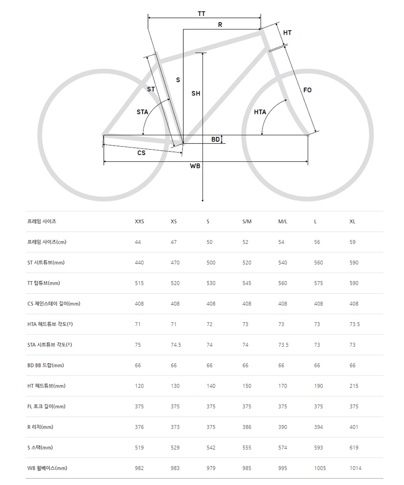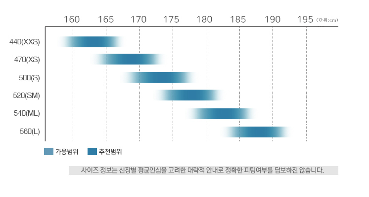 프레임 사이즈는 440부터 560까지 다양하게 준비되어 라이더 신체조건에 맞춘 피팅이 가능합니다.